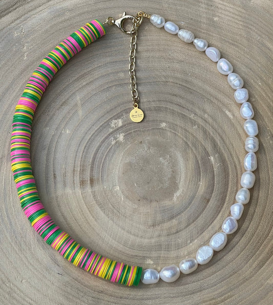Double Take Necklace: Freshwater Pearls Meet Fun Bright Phono Vinyl Beads Gold Clasp & Extender