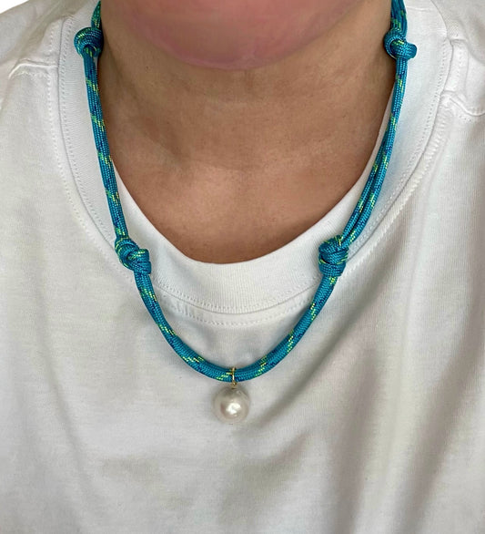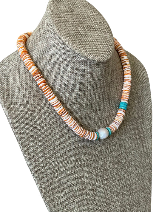 Baja Surf Necklace: Spiny Oyster Shell w Tuquoise (Howlite) and a Baroque Pearl Gold or Silver Clasp
