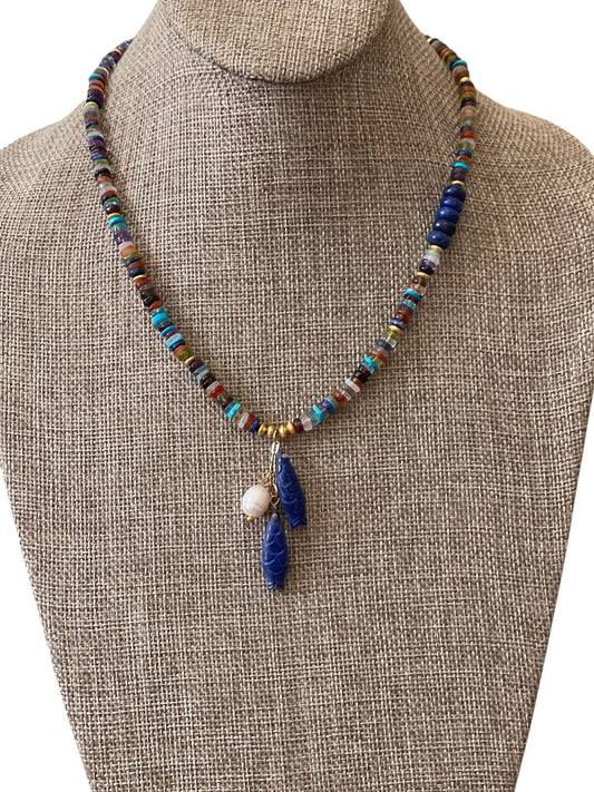 Catch Oโ the Day Necklace: Mixed Multi Gemstones w Lapis & gold accents Lapis fish & Pearl Charms OOAK