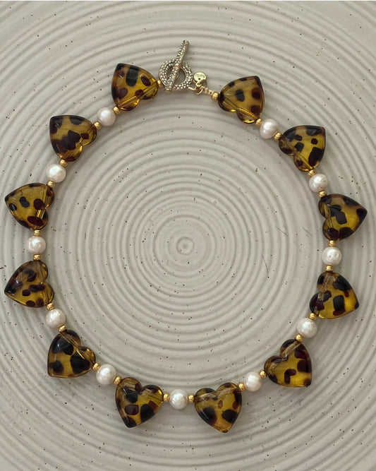 Leopard Love Necklace: Acrylic Leopard Print hearts with gold glass accent beads and Freshwater Pearls Gold Pavรฉ toggle clasp