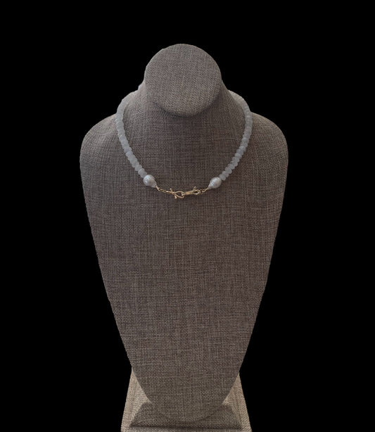 Indigo Lattice Necklace: Blue and white ceramic beads w pearlized glass spacer beads, Baroque Pearl center 14k accents & clasp OOAK