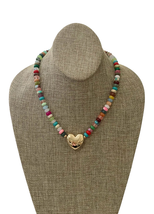 Charming Charlie Necklace: Mixed multi Gemstones providing vibrant colors and versatility Jumbo Gold Heart centerpiece Gold clasp w/ extender OOAK