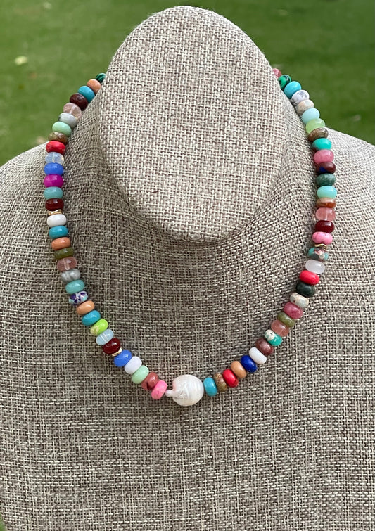 Joie Necklace: Colorful Mix of Natural Gemstones Gold Accent Beads and a Freshwater Baroque Pearl 2 Bead Size Options 6mm or 8mm