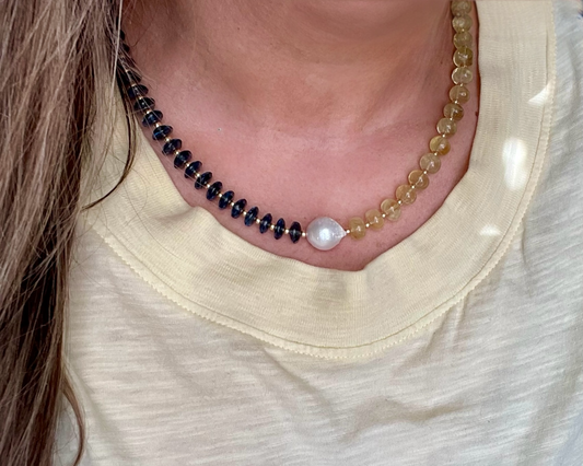 Lemon London Necklace: Lemon Quartz and London Blue Topaz Gemstone Beads Gold Accents Baroque Pearl Center OOAK