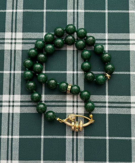 Vintage Vogue Necklace: Vintage Chinese Jade beads hand-knotted on matching satin cordโขGold pavรฉ accents and charms