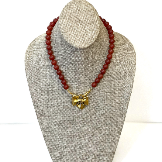 Matte Carnelian Bow Necklace: Matte Carnelian gemstone beads Antiqued gold bow pendant