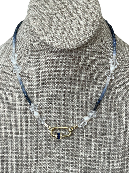 Starry Sky Necklace: Faceted Sapphire Gemstone beads in ombrรฉ pattern, Clear Quartz Stars, Freshwater Pearls, Gold clasp w blue CZ OOAK