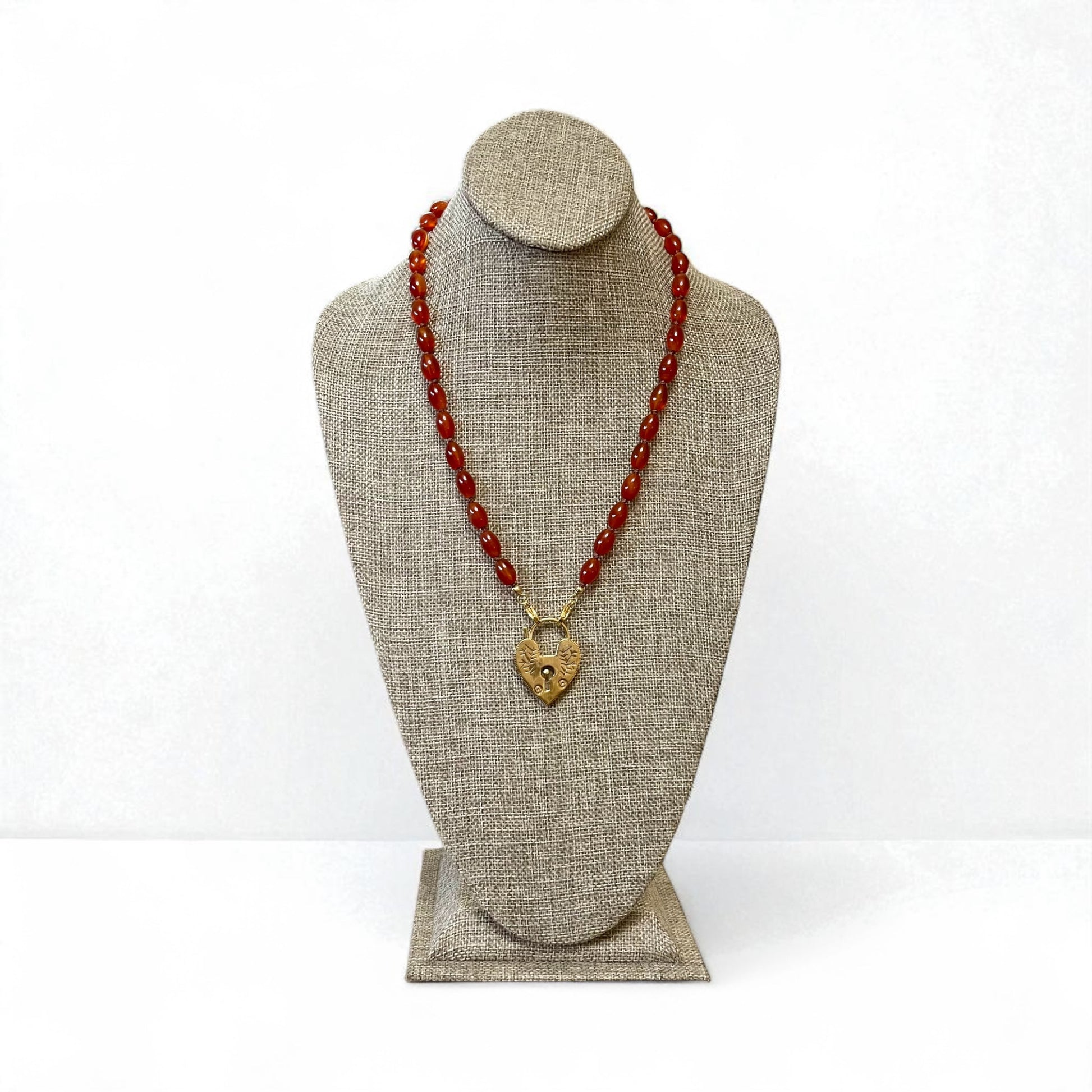 Carnelian Heartlock Necklace: Carnelian gemstone oval beads handknotted on warm brown silk GF heart pendant