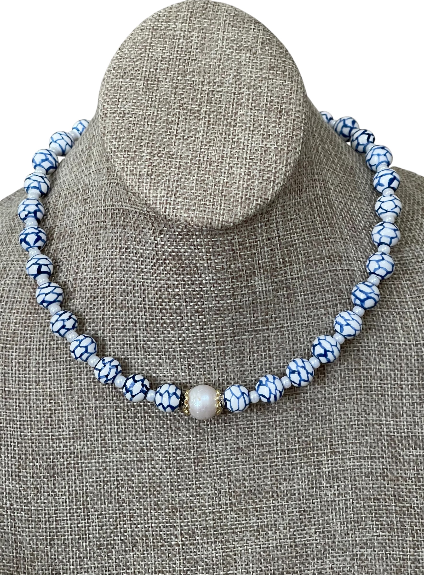 Indigo Lattice Necklace: Blue and white ceramic beads w pearlized glass spacer beads, Baroque Pearl center 14k accents & clasp OOAK