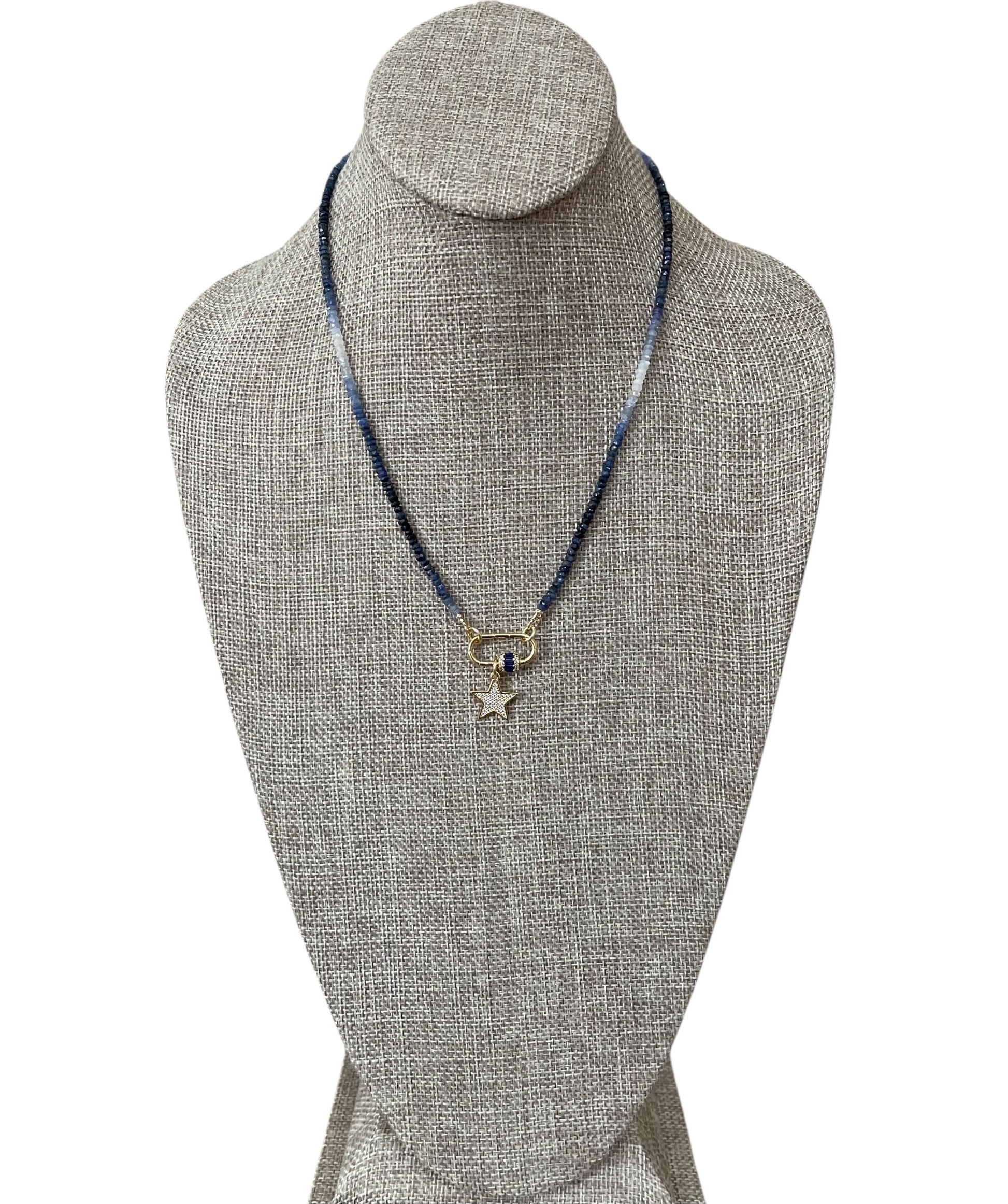Starlight Path Necklace: Faceted Sapphire Gemstone beads in an ombré pattern, Gold carabiner with deep blue CZ’s, Gold pavé star charm OOAK