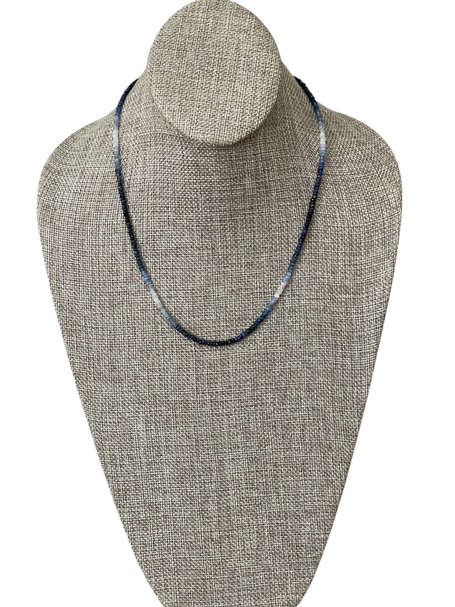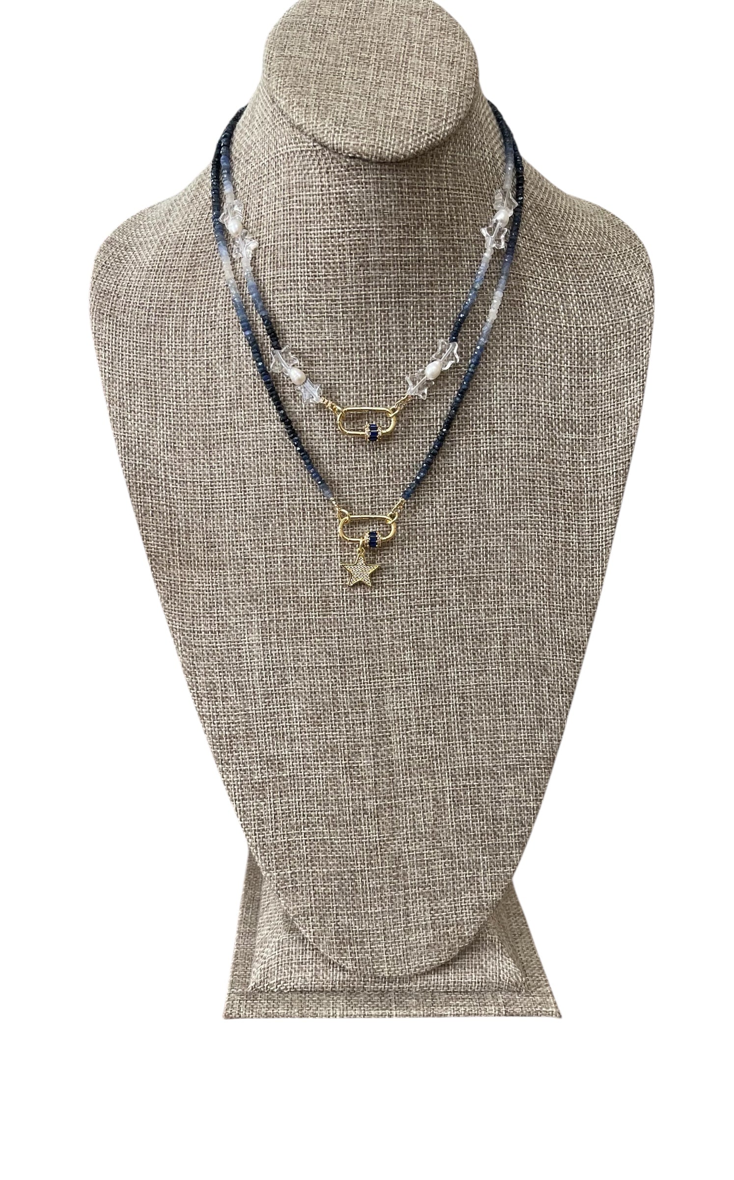 Follow the shimmer of the stars with this elegant design. Faceted sapphires in a stunning ombré pattern flow into a gold carabiner clasp adorned with deep blue CZ stones and a sparkling pavé star charm — a piece that feels as magical as a midnight sky. OOAK