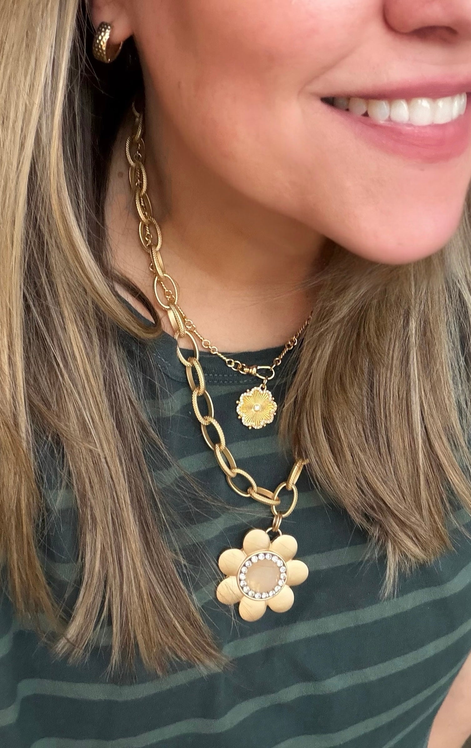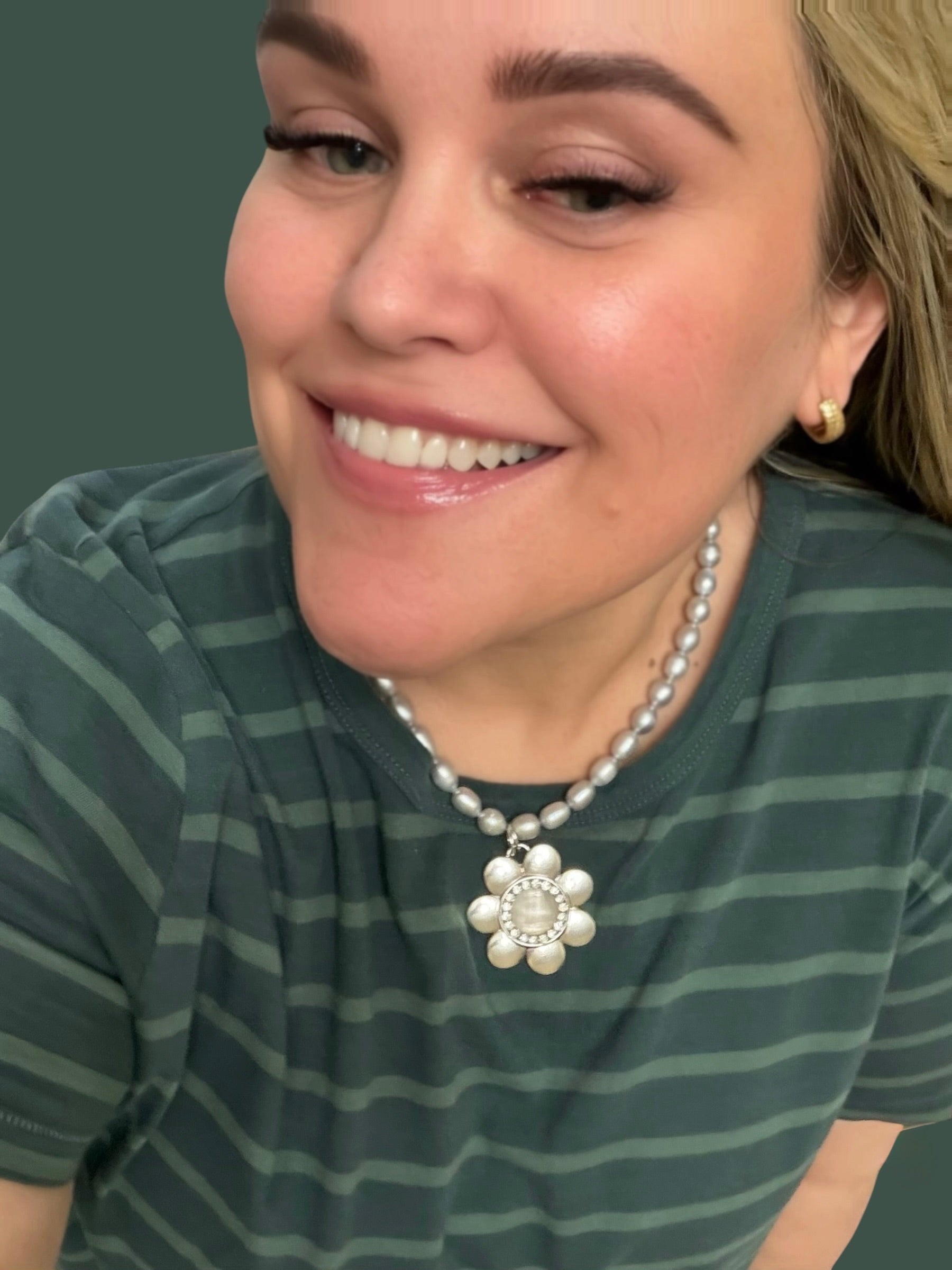 The daisy pendant measures 44mm (1.75”), making it a standout piece that still feels easy and fun to wear. Whether you’re dressing up a simple tee or adding the finishing touch to a spring dress, this necklace brings a fresh, happy energy to every look.