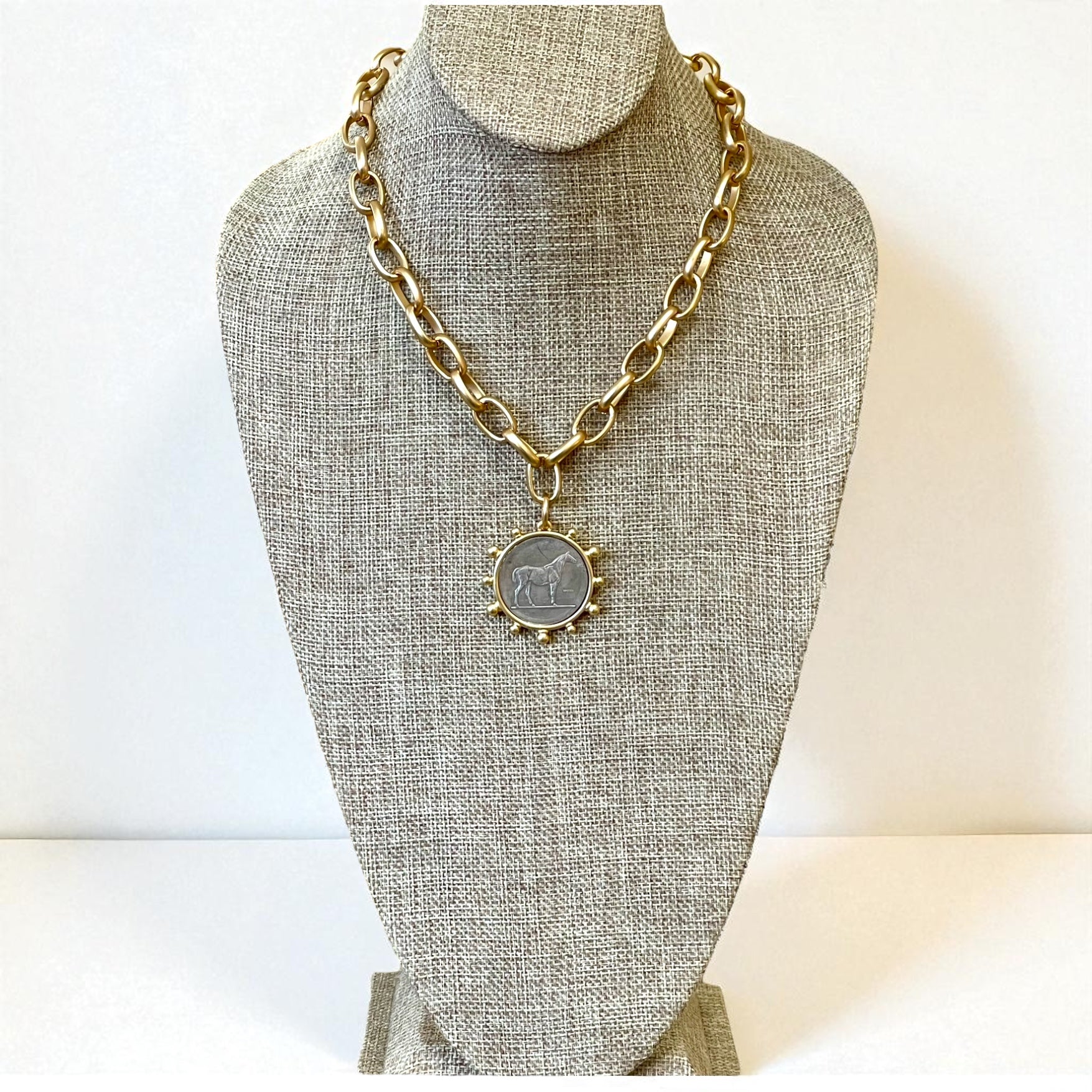 The Stallion Necklace pairs a matte gold chain with a matching matte gold bezel that frames a detailed pewter stallion coin — a timeless symbol of strength, freedom, and quiet confidence. The matte gold statement chain adds a modern, sculptural presence, while the antique-inspired coin brings a touch of heirloom character.
