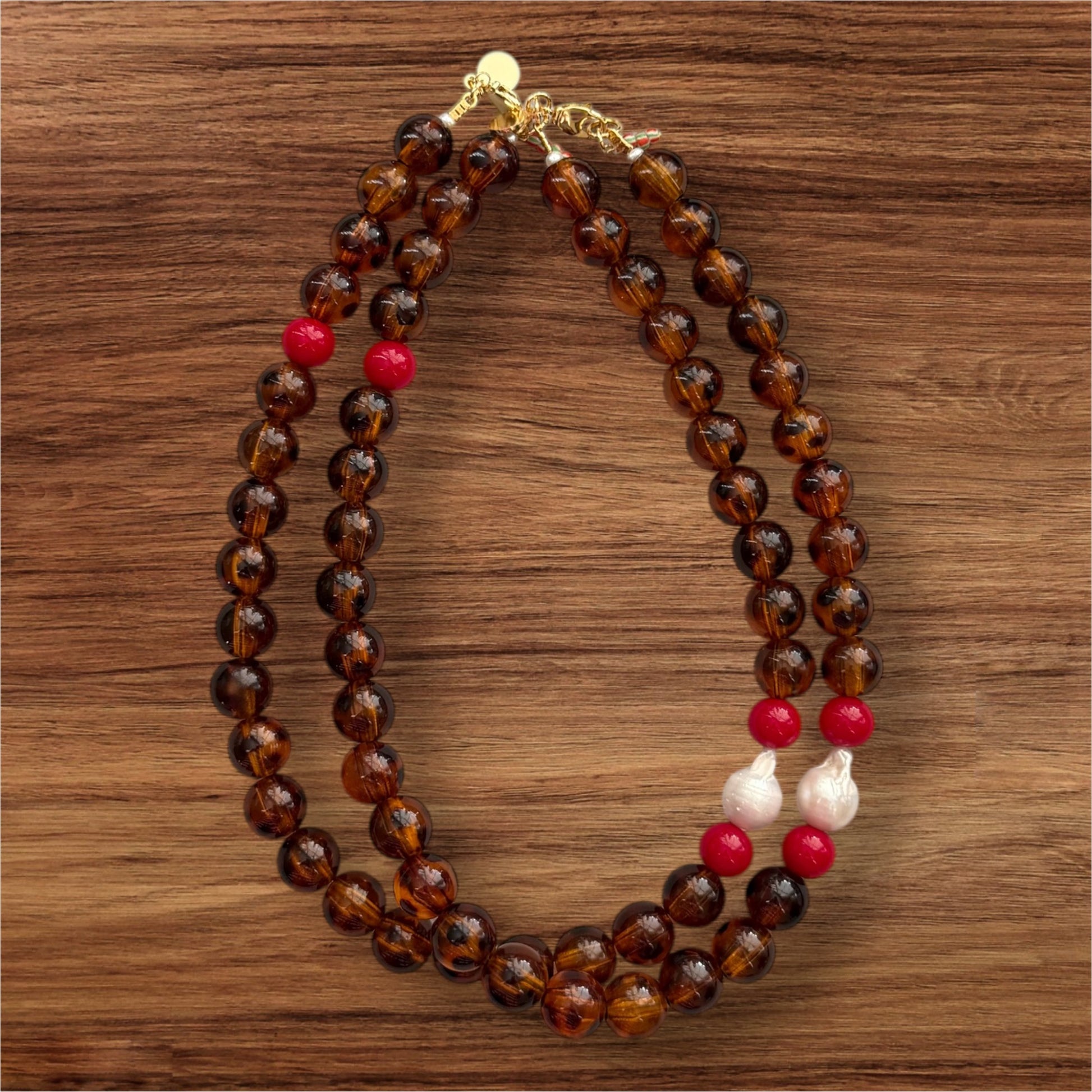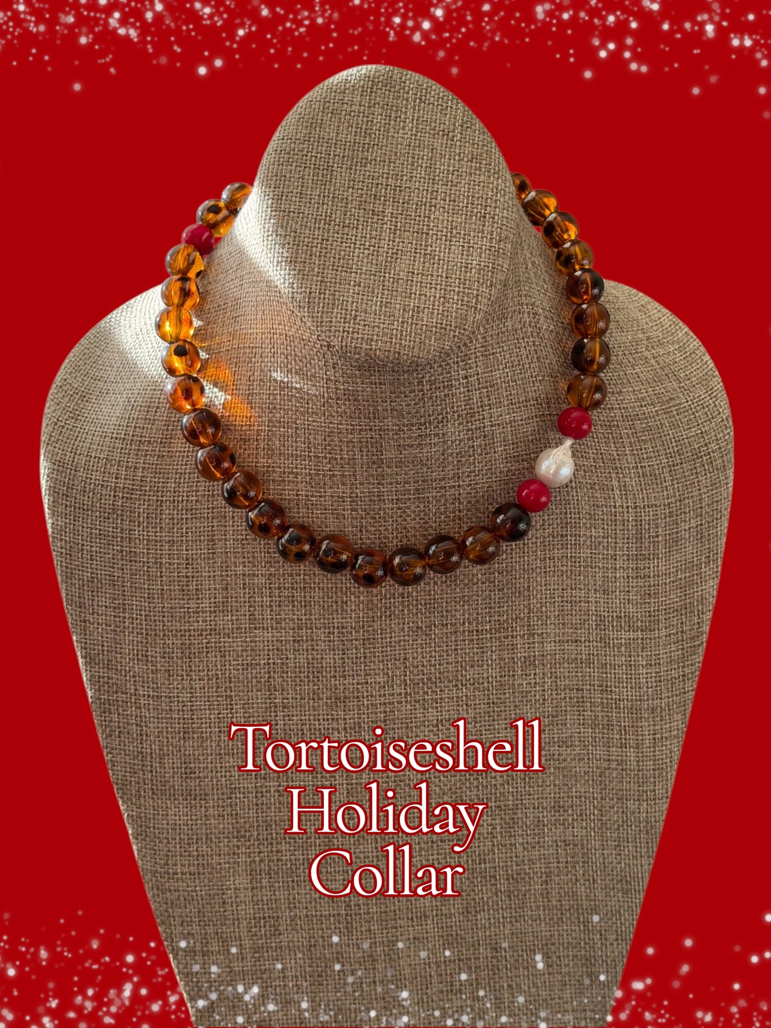 Tortoiseshell Holiday Collar: Resin beads with a natural Baroque Pearl and red glass beads Limited Edition